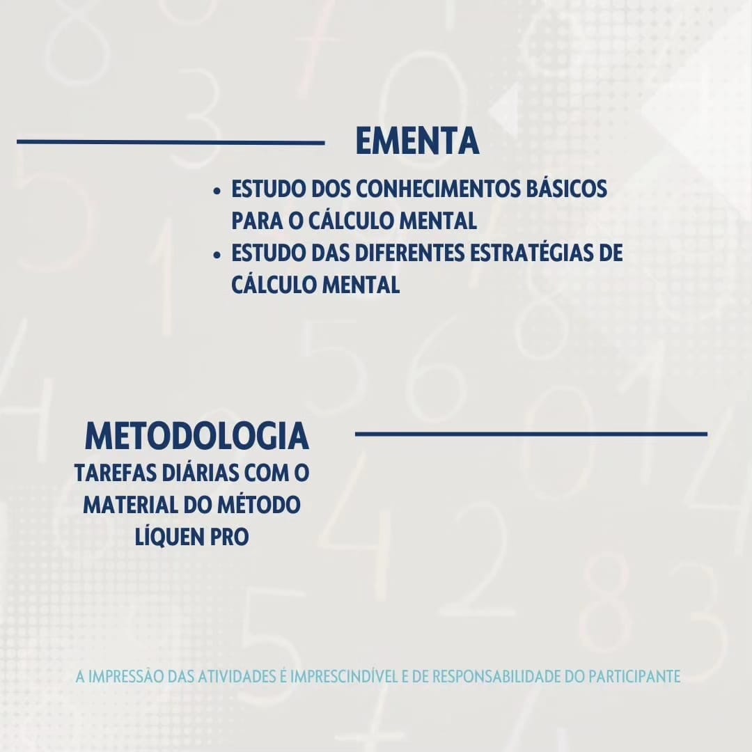 Os encontros síncronos serão via plataforma Meet e o material didático será disponibilizado semanalmente no formato PDF, ficando a impressão a cargo do aluno. A comunicação será via WhatsApp e site Método Líquen.